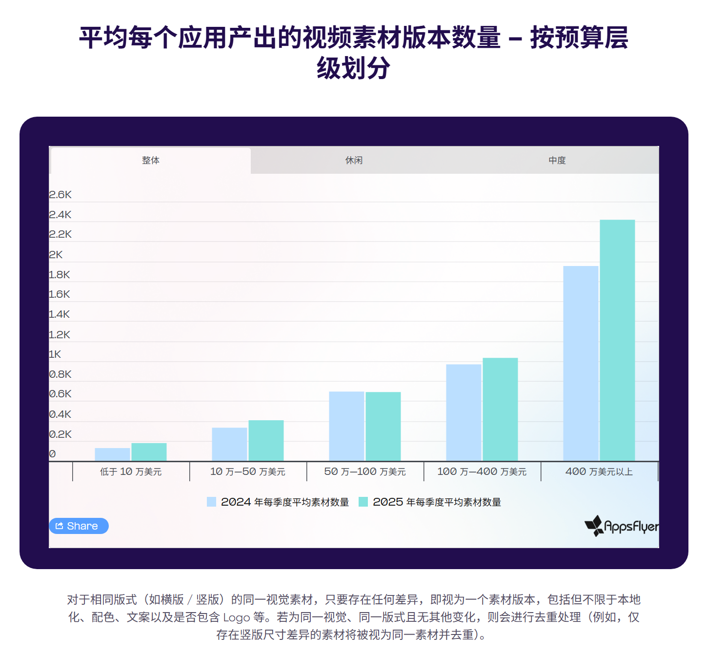 1.素材激增:AI驱动下的以量取胜。报告直接指出,在“素材激增”的背后,围绕「以量取胜」这一素材投放的核心逻辑,保持高频且稳定的测试节奏是取得成功的关键。2025年,头部广告主提升了素材产出规模,其单季度素材量已达到2400至2600个,同比增长25%至30%。规模较小的广告主(季度投放低于50万美元)同样加大了素材产出力度,同比增长20%至40%。预算较高的腰部广告主(季度投放100万至400万美元)其素材规模保持稳定或实现温和增长,单季度产量接近1000个。而预算较低的腰部团队(季度投放50万至100万美元)素材产出同比持平甚至有所下滑,在竞争加剧的环境下,减少素材数量反而会降低找到有效素材的概率。