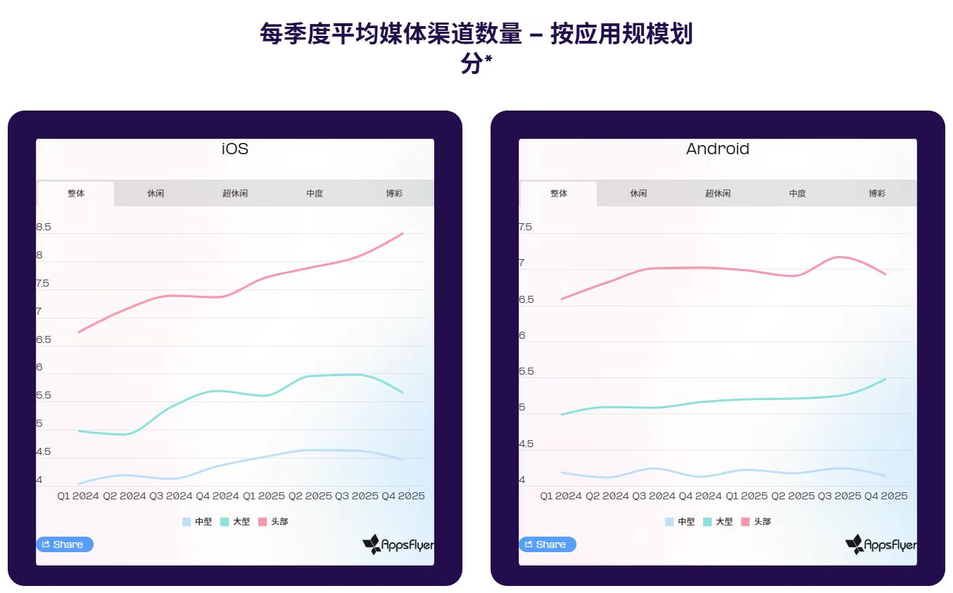 2.平台区别:Android转型加速,iOS内购集中。报告显示,Android平台IAA 模式正逐步让位于混合变现。博彩游戏IAP虽平均占比达72%,但仅采用IAA的博彩产品数量已下降33%,同时采用混合模式的游戏比例增长近20%。中度游戏的变现结构则更为集中:虽然仅采用IAA的中度游戏数量同比下降12%,更多产品逐步向混合模式转型,但仍有80%仅依赖IAP。随着开发与获客成本持续上升,复杂品类仅依赖IAA的变现模式已难以为继。