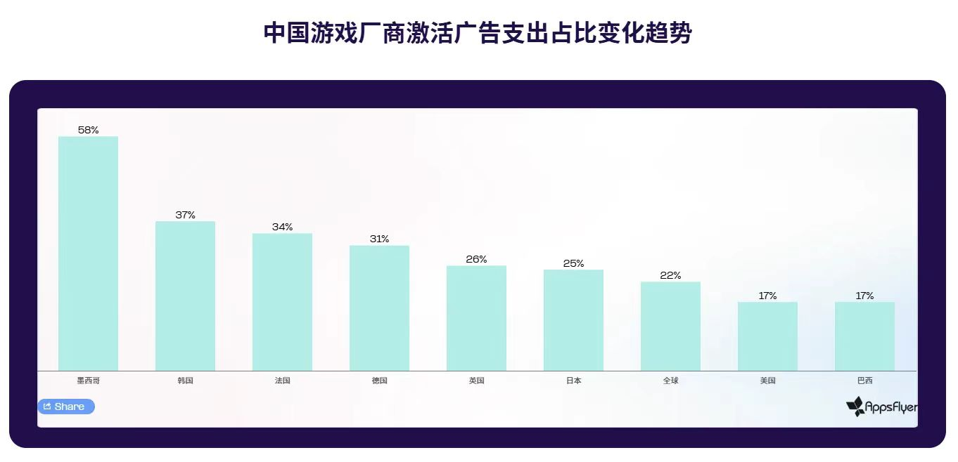 在全球市场整体趋于成熟、流量红利明显收敛的背景下,中国游戏厂商并未止步于存量竞争,而是通过更精细化的获客策略与更成熟的商业化能力,逐步建立起全球竞争优势。当前,中国厂商已占据约35%的全球游戏获客支出份额,并在成熟市场与新兴市场同步扩大影响力,显示出其在不同用户结构与商业环境下的适应能力。