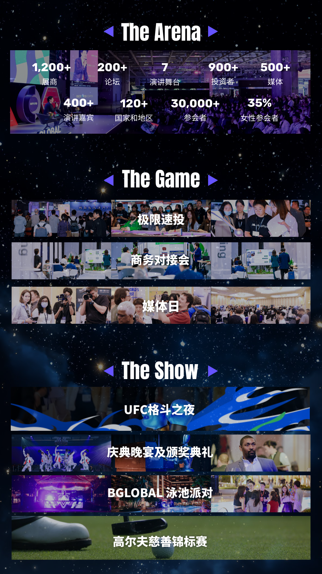 400+ 全球演讲嘉宾与 200+ 场论坛、7 大演讲舞台:围绕人工智能、国际投融资投资、女性科技、体育科技与区域合作等关键议题,构建跨产业、跨区域的深度对话网络。