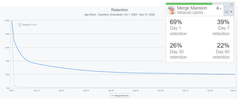 从《Merge Mansion》在2020年第四季度创下的数据来看,其成功几乎带有某种“现象级”的预示:次日留存率高达69%,60日留存仍保持在22%——这意味着近七成用户在下载次日选择回归,而两个月后仍有超过五分之一的玩家持续活跃。在移动游戏领域,这样的留存表现不仅出色,甚至可被称为“超常”。