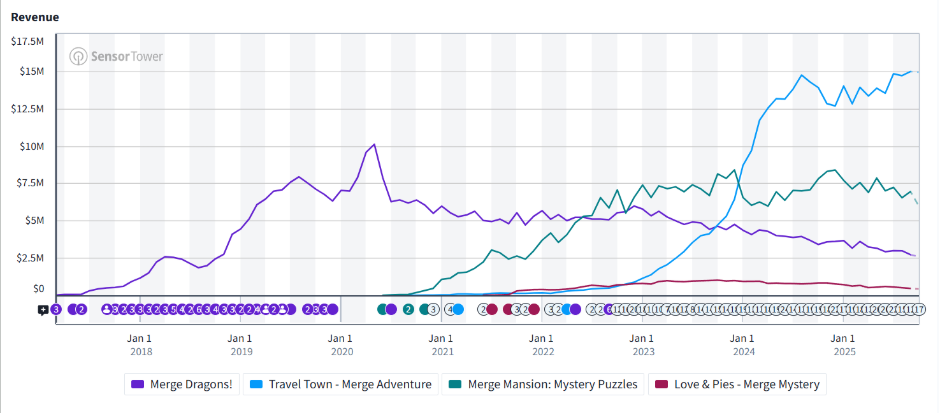 从上方的图表可以看出,《Merge Dragons》《Merge Mansion》和《Love & Pies》的收入表现都难以接近传统三消游戏的水平。目前营收表现最突出的是《Travel Town》,但即便如此,它的增长似乎也遇到了瓶颈(至少目前如此)。不过,我其实还保留了一些信息——现在我将向图表中添加两款游戏,这会让整个故事彻底改观。