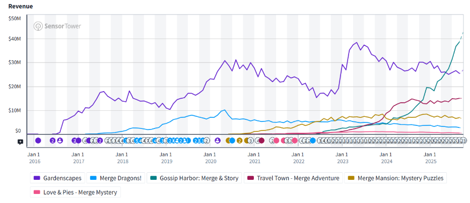 从图表中可见,《Gossip Harbor》是目前唯一一款收入表现极为突出且仍在持续攀升的游戏。在撰写本文时,它的收入甚至已超越《Gardenscapes》——这对于一款合成游戏来说堪称惊人。