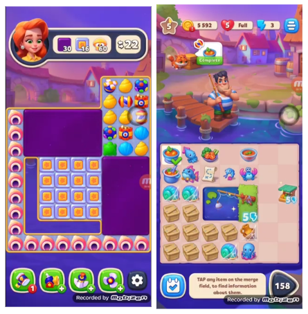 《Matching Story》与《Merge Gardens》游戏界面,二者均包含合成与三消元素