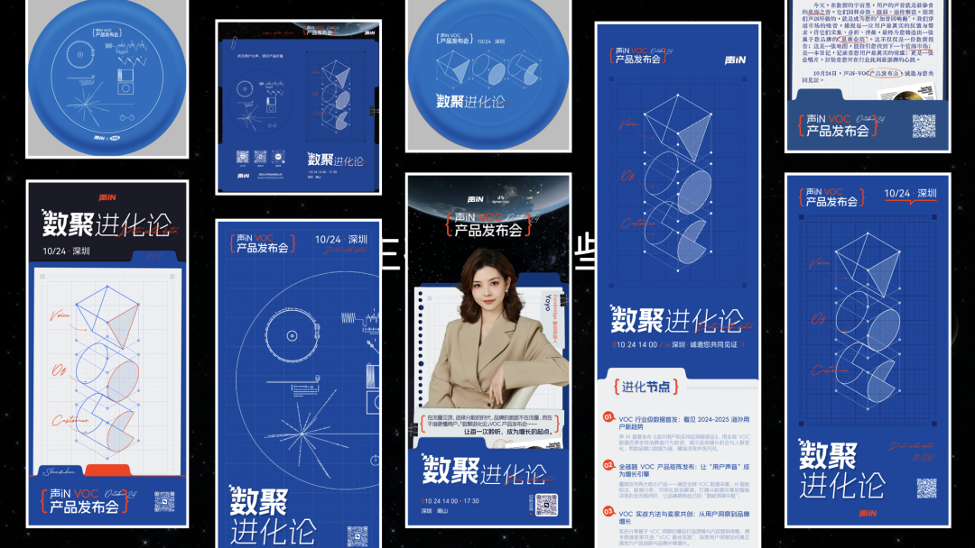 创意的原点源自 1977 年 NASA 发射的“旅行者号”探测器。吉祥茄子分享道:“旅行者号携带了一张镀金铜质唱片,记录人类文明的声音与图像,如同一份寄往深空的‘时间胶囊’。”这种“用有限数据探索无垠未知”的使命感,与声 iN 的愿景不谋而合。因此,团队将发布会风格定为「科技蓝图」——不冰冷,而是带有工业风的扎实与探索的浪漫。主视觉中融入档案、图纸、代码、卫星等元素,致敬那份“将宏大愿景绘于蓝图”的郑重感。团队还特别将“金唱片”复刻于伴手礼飞盘上,让探索精神与每一位参与者同行