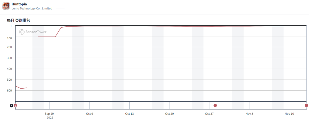 今年9月,广州乐牛旗下《Huntopia》在全球发布,很快便跻身美国Google Play游戏畅销榜TOP100,此后长期保持在RPG品类畅销榜前20名。