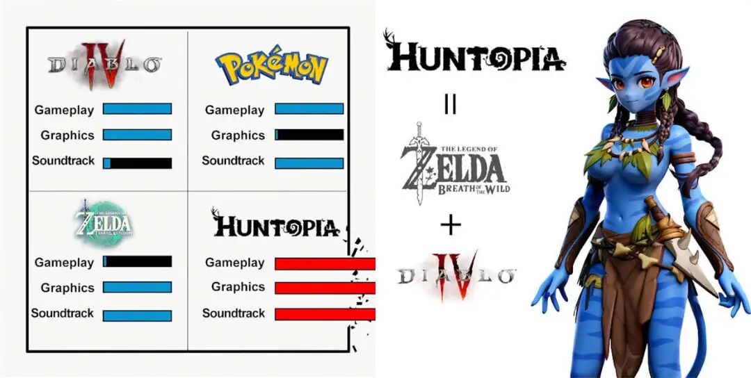 例如,有的素材会拎出另外三款游戏,从玩法、画面及音乐等维度与《Huntopia》展开对比,进而营造《Huntopia》各项表现爆表的假象;有的素材会展示带有阿凡达、原始人(barbarian)要素的角色,有的素材还会从场景到构图让人幻视《魔兽世界》;甚至有些素材使用了诸如「无尽AFK」「堪比《原神》」「DIABLO+ZELDA=HUNTOPIA」的关键词进行宣传。