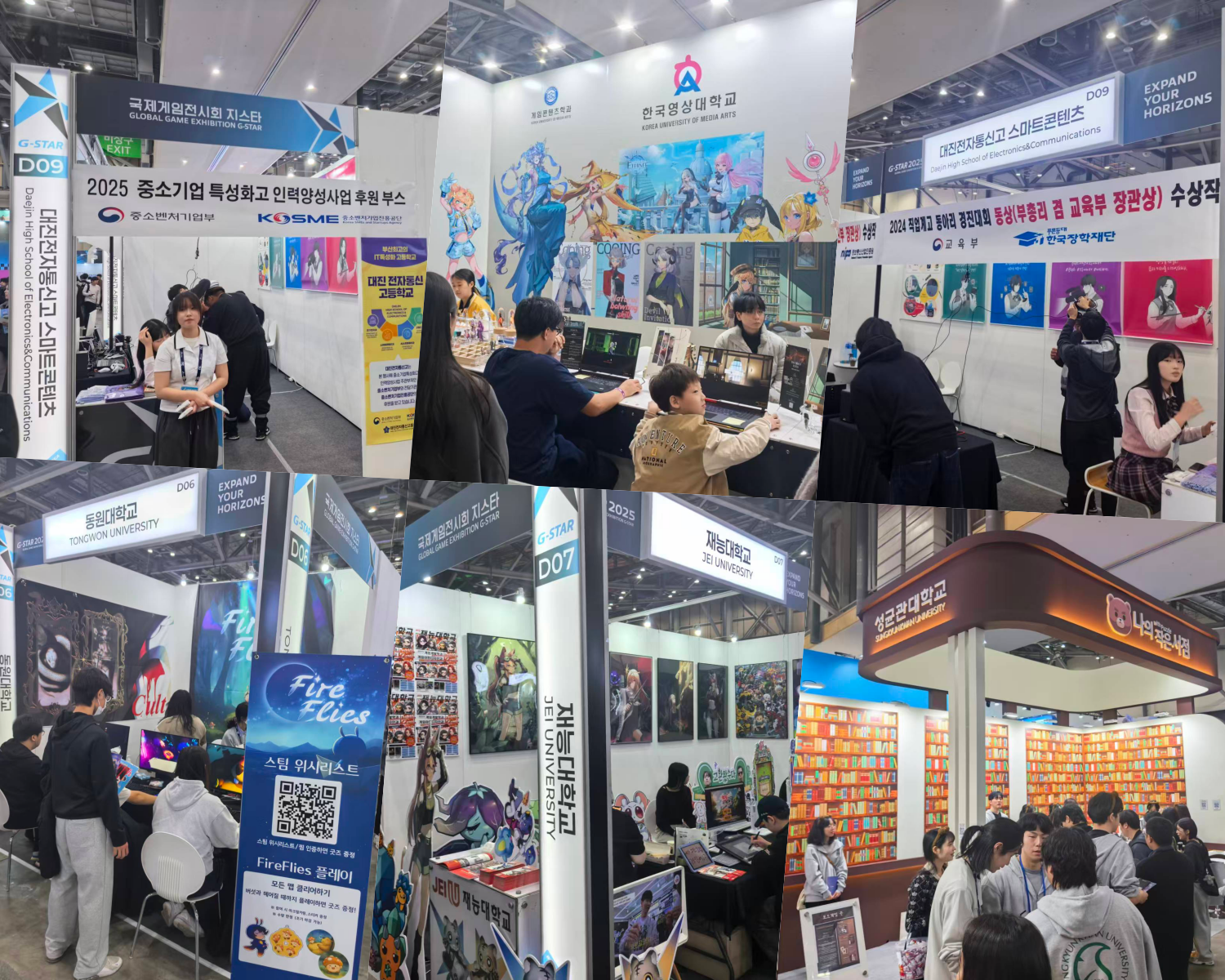 教育机构的存在格外醒目——包括大田电子通信高中、济异大学、东园大学、韩国影像艺术大学与成均馆大学等多所院校都设立了展位,展示学生原创游戏、交互体验与美术作品,让展会在大型厂商之外呈现出一条更具活力的新创意线。
