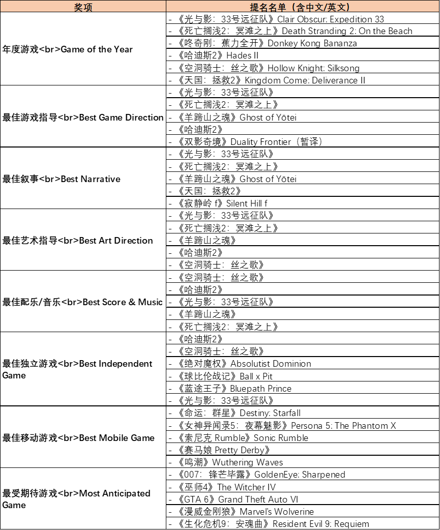 看完这份完整提名,你心里的年度游戏已经有答案了吗?是12项提名在手的《光与影:33号远征队》,还是稳扎稳打的3A大作?更别忘了为《鸣潮》《P5X》这两款国产冲奖手游打call。