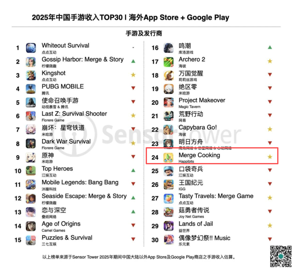 最近,一款上线已有三年的合成手游《MergeCooking》出现在SensorTower中国出海手游收入Top30榜单中。在当前合成赛道中,市场注意力更多集中在柠檬微趣旗下的《GossipHarbor》等头部产品身上,而这款并非出自头部厂商的老产品,能够在此时进入收入榜单,显然并不常见。
