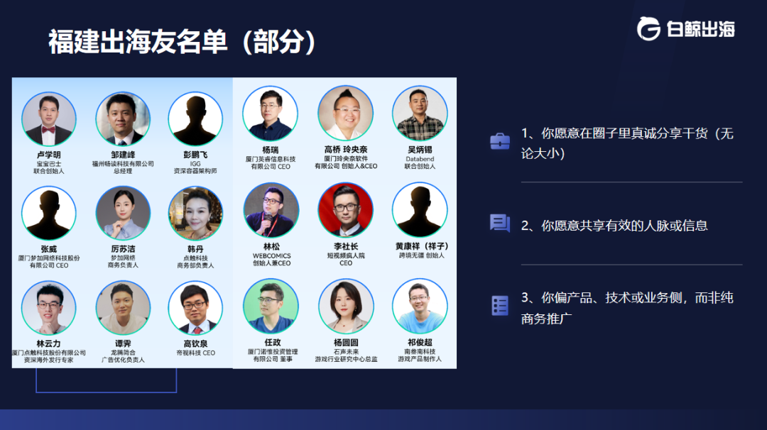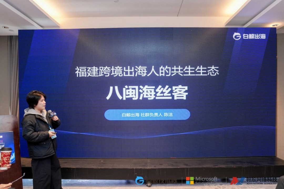 98出海社群负责人陈洁女士随后登台,正式发布“八闽海丝客”计划。她指出,福建拥有深厚的出海基因与文化认同,但企业间往往缺乏持续、深度的连接。过去十年,白鲸累积了全球超20W出海开发者名片,其中福建本土企业超6000家,打造了“八闽海丝客”——一个专注服务于福建籍及在闽发展的跨境出海从业者的实名圈层。