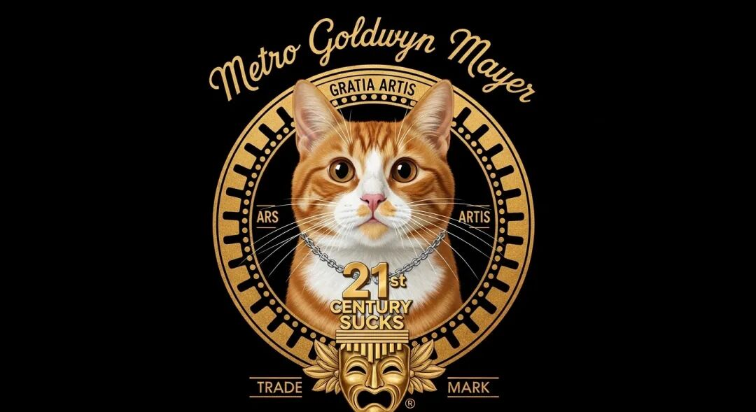 Replace the lion in the MGM logo with an orange cat with a necklace that says 21st Century Sucks