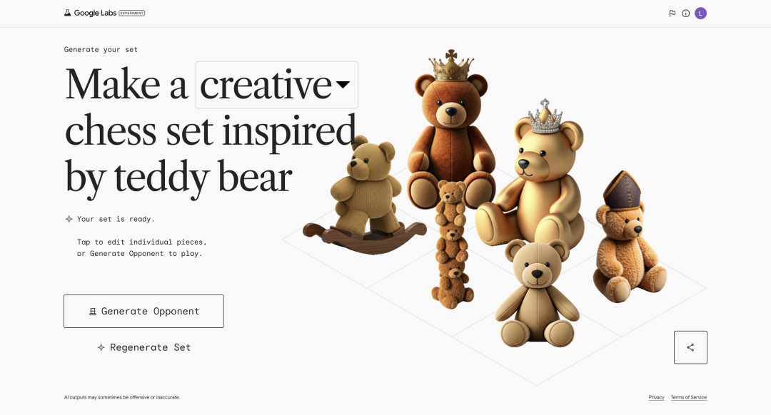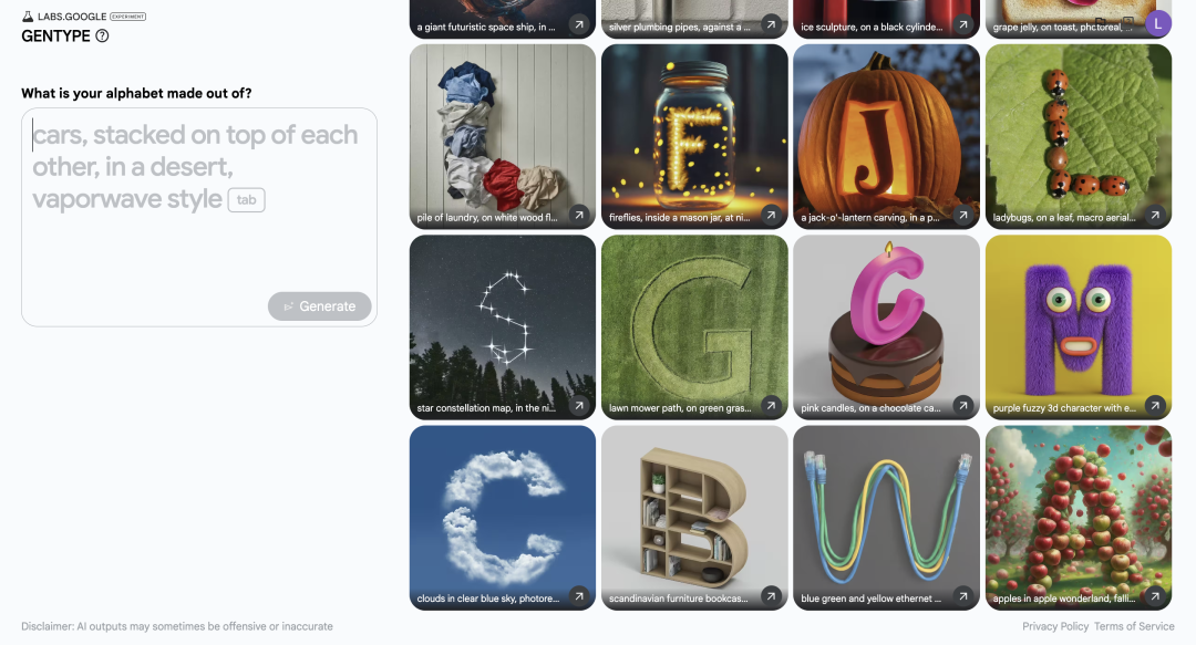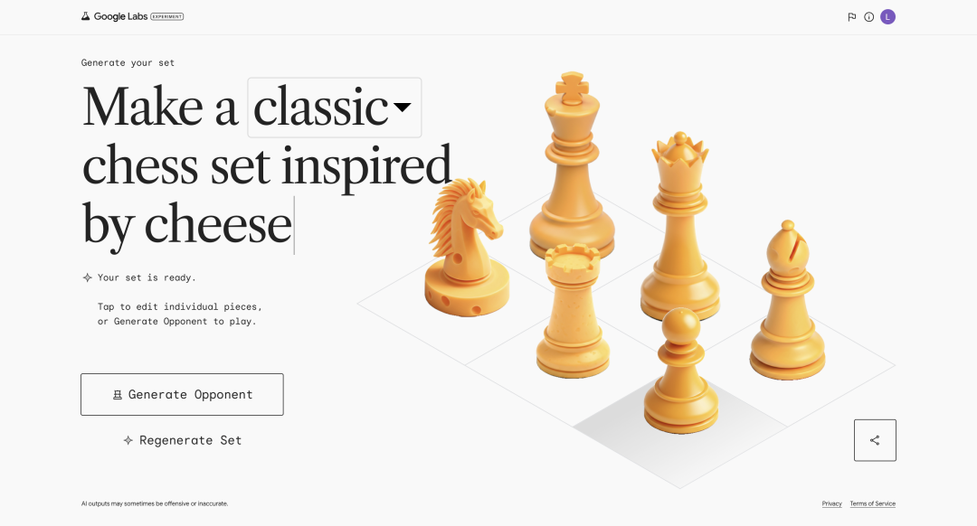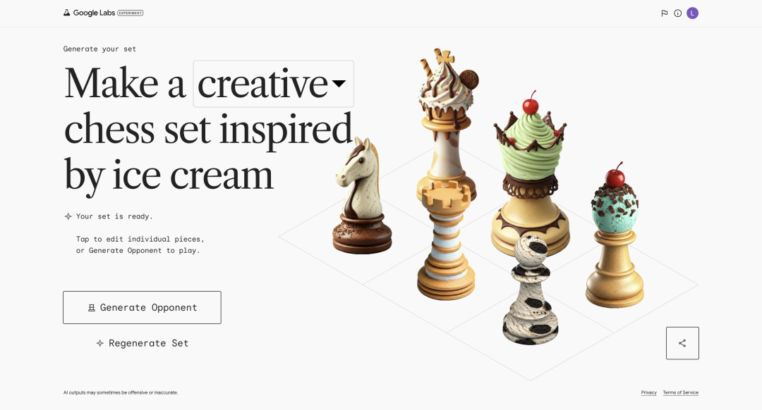 比如AI生图工具Whisk、AI生成字体Gen Type、把名画变成AI生成音乐的Mixtape、AI定制食谱Food Mood、AI导游Talking Tours、AI职业规划师Career Dreamer、象棋游戏生成器Gen Chess……