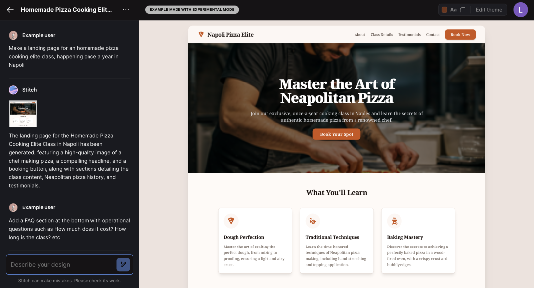 比如让它生成一个“那不勒斯披萨课程”的报名落地页,包括封面图、标题文案、课程内容介绍、报名按钮和用户评价区:
