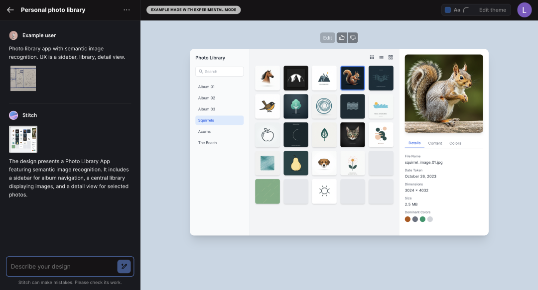 让它做一个带有语义识别能力的个人图像库,Stitch生成了一个包含侧边栏分类、图片浏览区、详细信息查看面板的完整UI: