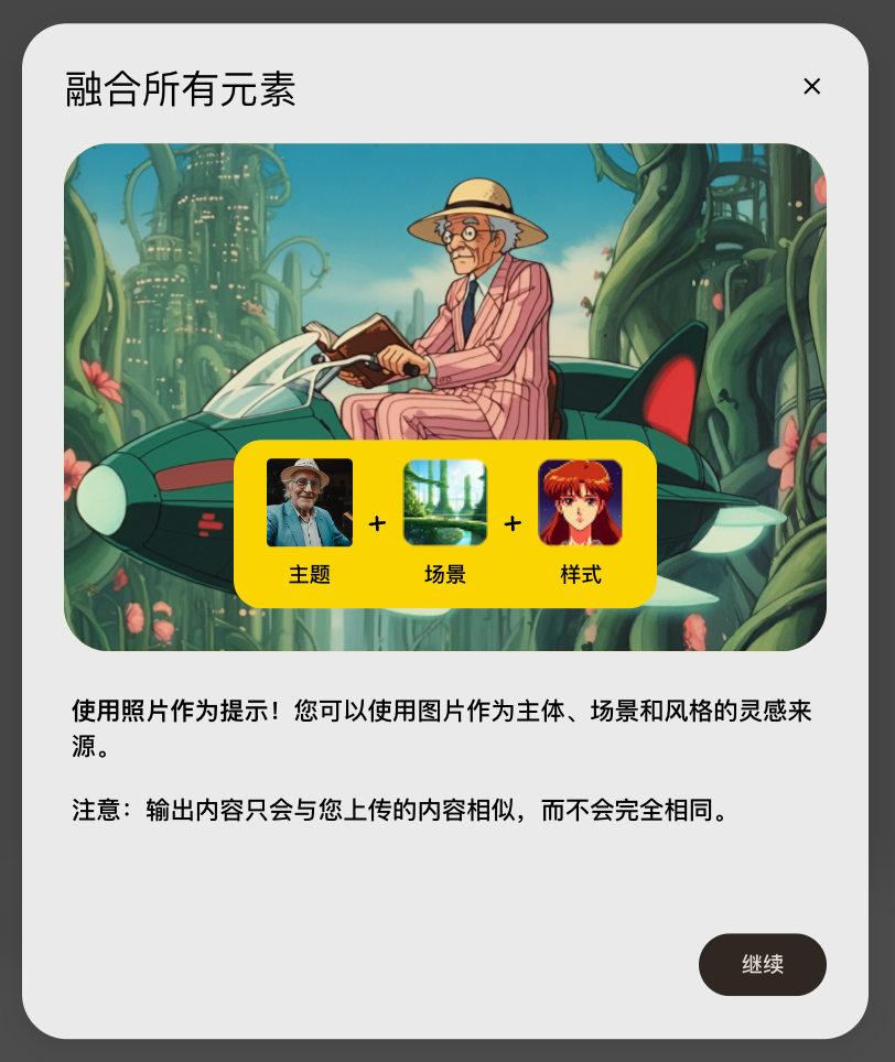要知道,大多数生图工具主要依赖文字提示,用户需要通过精细的描述性文字来指导AI生成图像。而Whisk的核心功能是允许用户上传图片作为主题、场景和风格样式的参考。