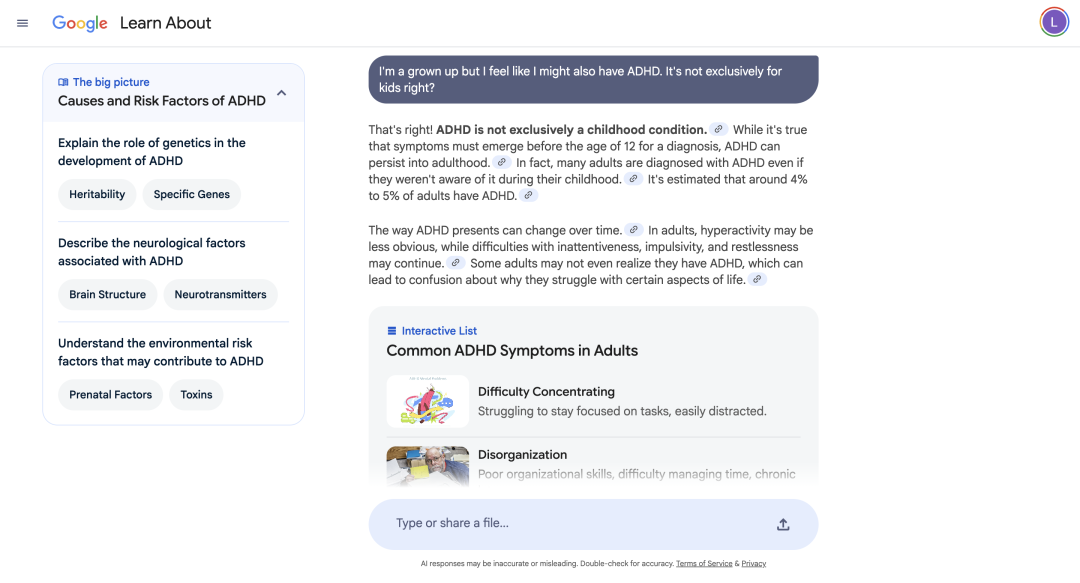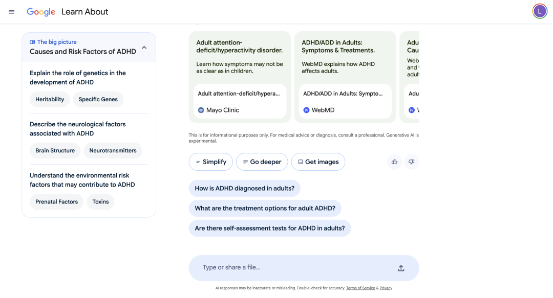 进入Learn About首页,会看到一个类似搜索引擎的页面,你可以像使用普通搜索一样在搜索框输入问题,比如“成年人也会有ADHD吗”,但得到的回答与传统搜索结果页大不相同。