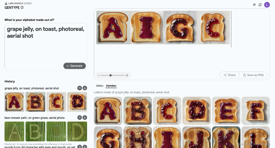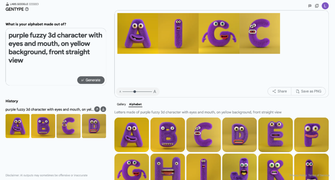 只要在输入框中描述字母的材质、呈现方式、拍摄视角等,AI就会生成一整套字母图像,从A到Z,风格统一,可下载为PNG图片,作为拼贴素材、视频字幕贴纸等使用。