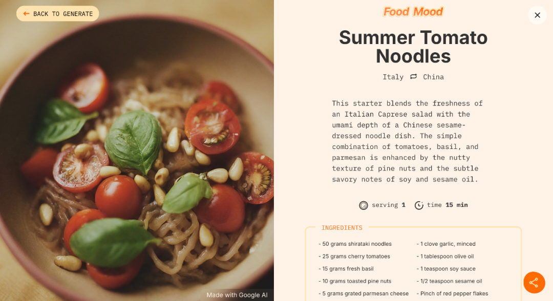 比如我想做一道融合中国和意大利风味的前菜,AI生成的食谱是Summer Tomato Noodles(夏日番茄凉面),不仅附上了菜品简介和精致插图,还标注了所需食材、份量、制作步骤、贴士建议等,页面风格清爽,信息清晰。
