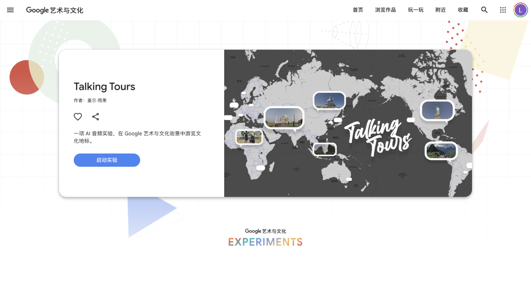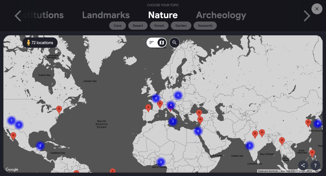 打开Talking Tours页面,你会看到一张互动地图,涵盖全球多个文化地标和自然景观,分为多个主题:文化机构(博物馆、图书馆、剧院)、地标建筑、古迹和自然景观(森林、洞穴、沙漠、园林、海洋)。