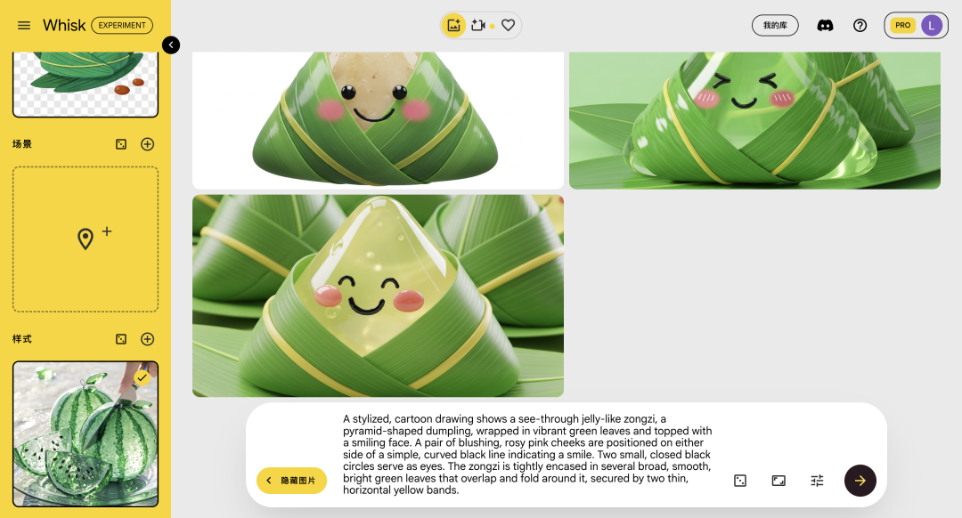上传一张卡通粽子图作为主体,透明果冻质地的西瓜图作为样式参考,简单修改下提示词就可以得到: