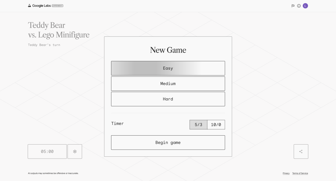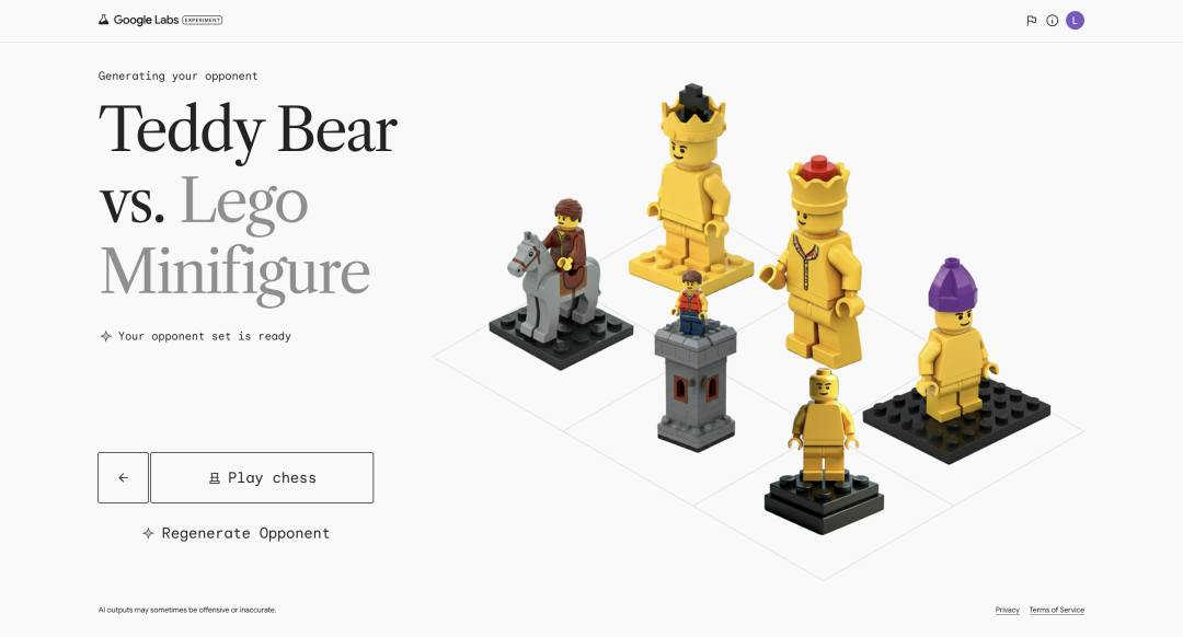 生成我方棋子后,AI会自动生成一套对手棋子,不满意可以重新生成,确认后点击“Play Chess”即可开局,难度分为Easy / Medium / Hard三档。太久没玩忘记规则的我,这局也是毫无悬念地输给了AI。