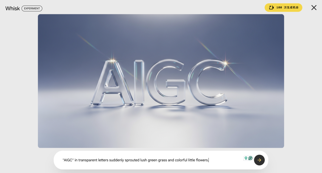 再点击图片左上角的“添加动画效果”,输入提示词:透明的AIGC字母内部突然被绿藓充满并且长出小雏菊。