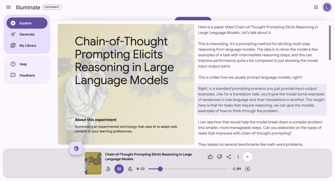 整体上,Illuminate和NotebookLM都适合想要快速了解内容要点,边听边学的用户。哪怕没时间读完整篇论文、整本书,也能听两个AI聊个大概。