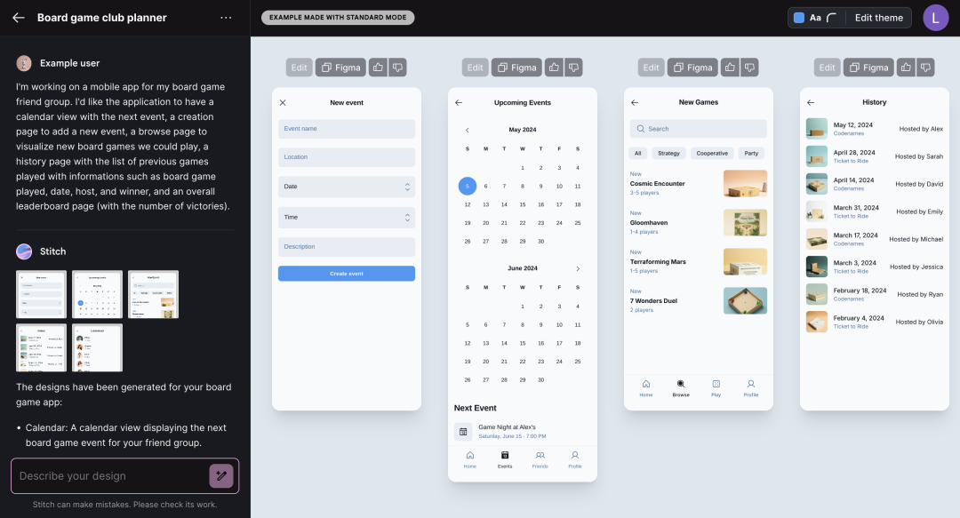 再比如让它做一个桌游俱乐部活动管理App,需要包括事件添加页面、日历视图、游戏浏览页、历史记录页在内的完整多页设计原型: