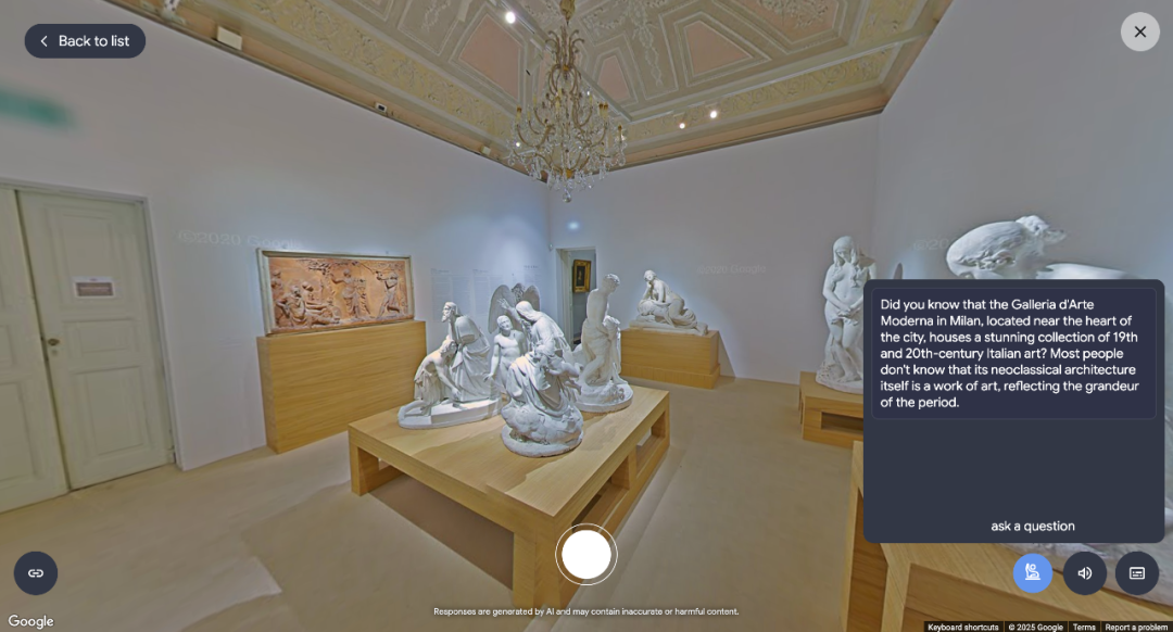 点击地图上的坐标,即可进入对应地点的沉浸式街景视图。AI导游会讲解该地点的背景信息,比如某所博物馆的建筑风格、历史典故,甚至细节到展厅里壁纸的设计灵感。