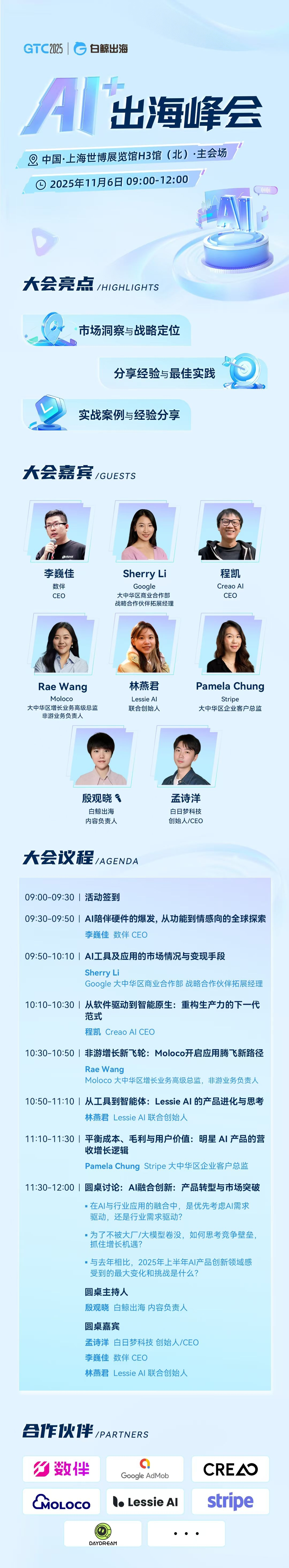 作为本次大会的核心环节,主会场“AI+出海峰会”将聚焦 AI 技术与出海实战的结合,邀请来自数伴、Google、万兴科技、Moloco、Lessie AI、Stripe、白日科技等企业的资深专家与创始人,分享他们在 AI 产品构建、市场拓展与商业变现方面的实战经验与思考。