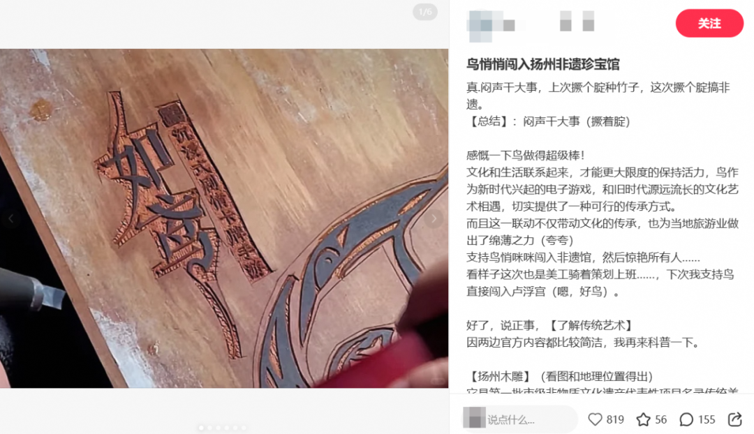 就在过去不久的五一,《如鸢》就与扬州非遗珍宝馆开展了合作,《如鸢》不仅把扬州元素融入游戏,其联动雕版《如鸢:鸢起广陵》与《如鸢:广陵王玺》也将作为扬州非遗珍宝馆基本陈列长期展出,这场典型的文博联动吸引了许多玩家去沉浸式体验传统文化。