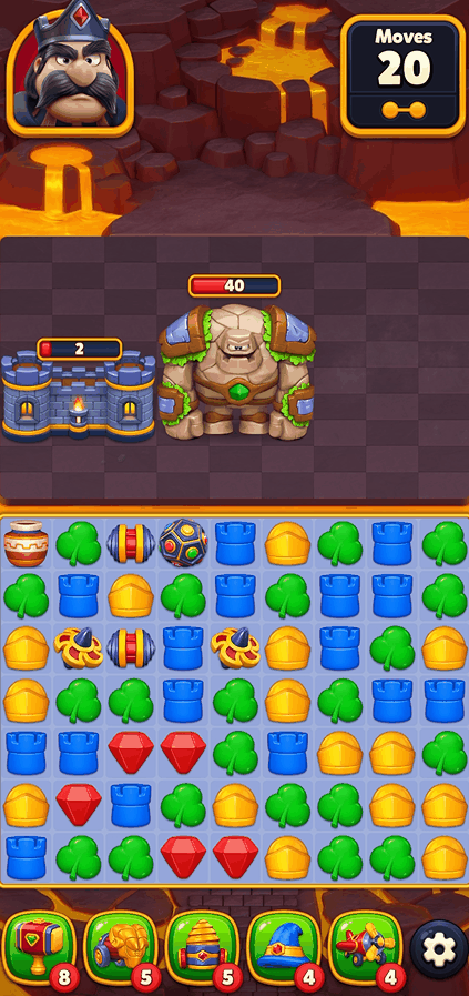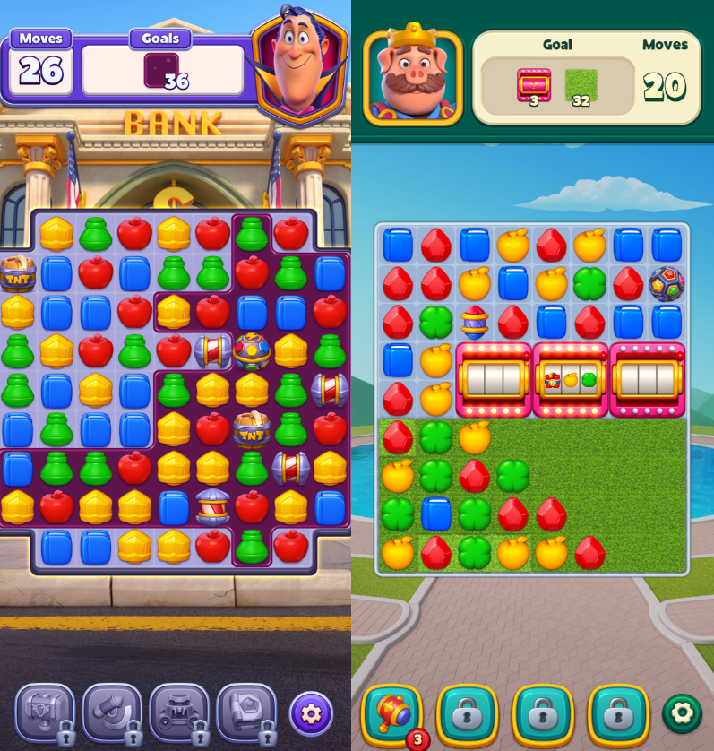 两款游戏也都在玩法设计上尝试了调整。例如《Match Villains》中设计了棋盘的关卡,能够更加凸显出道具的作用。《Piggy Kingdom》中则用「老虎机」代替了《Royal Match》中的「橱柜」,消除该目标所需的次数变得不确定,而且消除后还会随机生成一项合成道具。