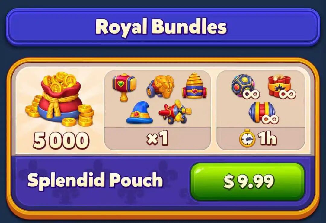 Splendid Pouch的内容包括5000金币、一小时内无限次增加合成道具、以及5种助推道具各一个。礼包内容基本和《Royal Match》中的保持一致。但《Royal Kingdom》除了保留了原先4种助推道具之外,还新增加了「轰炸机」——随机在棋盘上丢放3个炸弹。这也让玩家在闯关过程中有更多的策略选择空间。