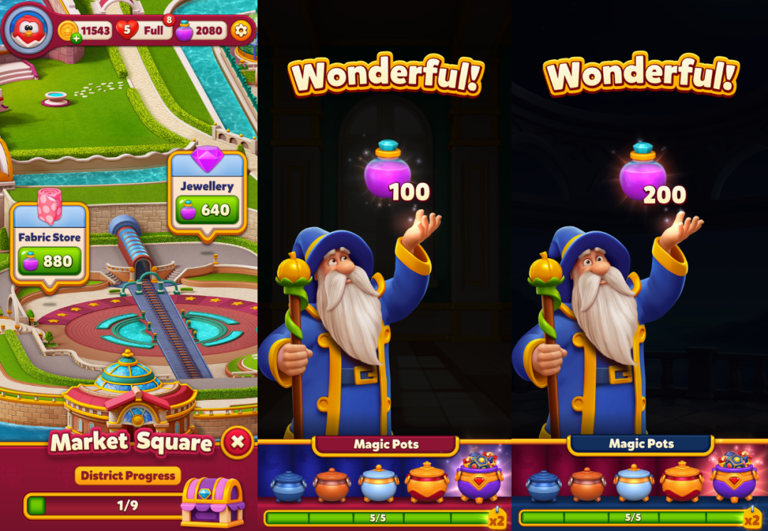 尽管《Royal Kingdom》对比《Royal Match》没有太多颠覆性的创新。不过游戏利用了免费金币奖励的稀缺性、合成道具和助推道具的实用性,在引导玩家付费方面似乎做得更加成熟。