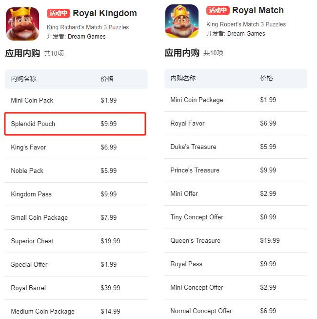 对比《Royal Kingdom》和《Royal Match》的头部内购项目可以发现,《Royal Kingdom》中售价9.99美元的Splendid Pouch也是销量比较高的内容。根据Sensor Tower检测数据,该内购项目从去年12月初开始就仅次于小型金币补给包的位置,并且保持至今。