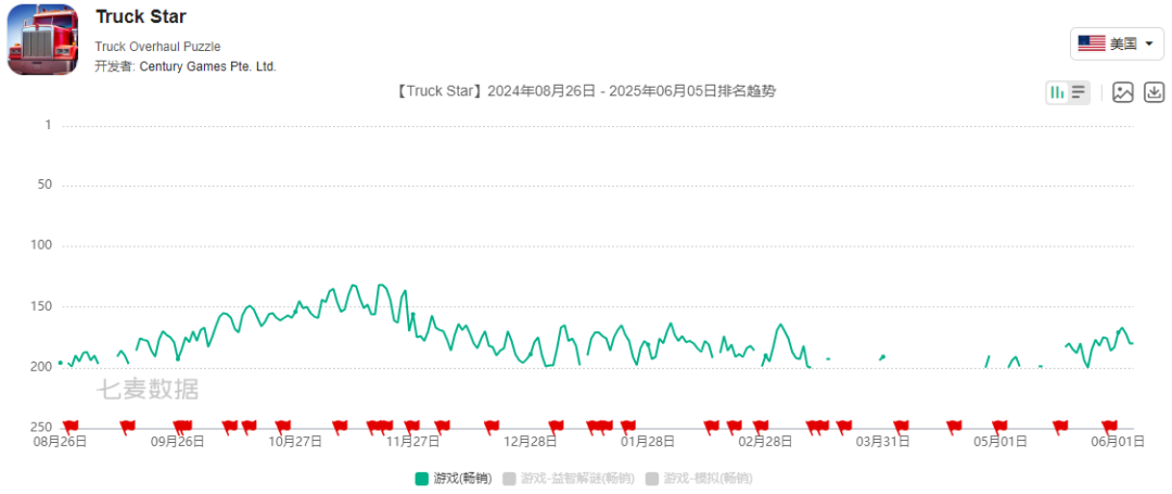 比如点点互动在过去一年来就对消除品类表现出更多热情。一年前点点互动在海外上线了《Truck Star》并初获成果。游戏在美国iOS畅销榜上爬榜了三个月之后有所下滑,近期又重新有回暖的迹象。同时国内版本《消消闯天下》今年开始发力,3月一度登顶微信小游戏人气榜,近两个月的iOS畅销榜排名也在逐渐攀升,不过尚未进入到前200名。