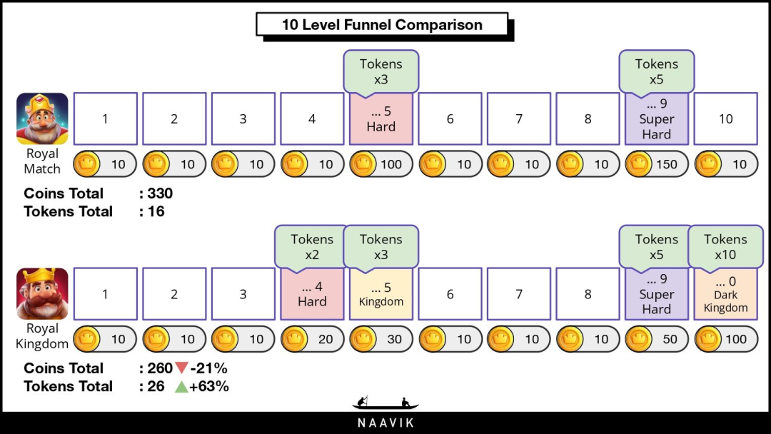 整体而言,PVE关卡让《Royal Kingdom》往重度的方向挪了一步。半年前Naavik研究表示,《Royal Kingdom》比《Royal Match》更难,而且闯关后的金币奖励更少。这使得玩家更需要通过利用道具和付费来进行闯关。