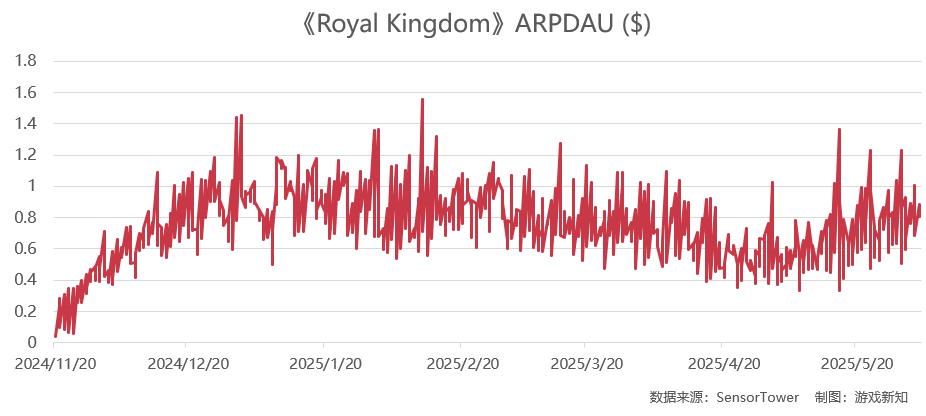 相关数据显示,《Royal Kingdom》在释出这批明星视频素材的同时也加大了投放力度,展示估值达到游戏上线以来的峰值。而根据Sensor Tower的数据,游戏的ARPDAU也同步停止了下滑且重新回暖,意味着游戏的这轮推广依然能够找到更多有价值的用户。