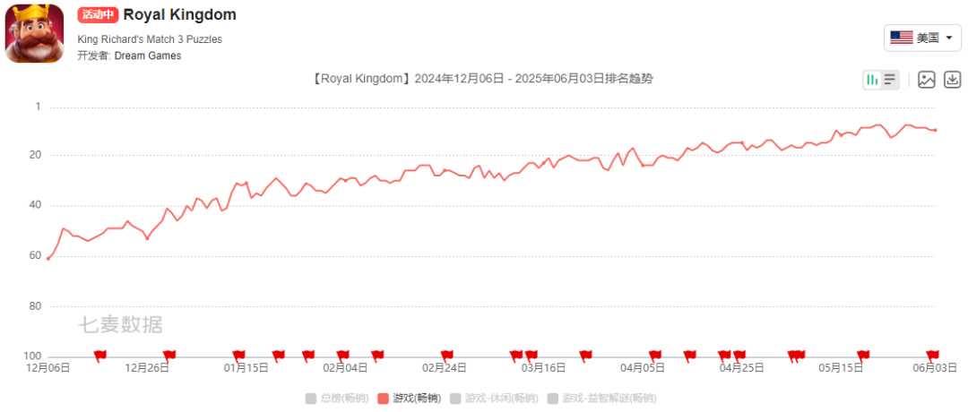 也是在这样的背景下,Dream Games在去年年底上线了三消新品《Royal Kingdom》。当时外界曾有疑虑这款游戏会不会挤压《Royal Match》的市场,不过最近这样的想法便逐渐消散。